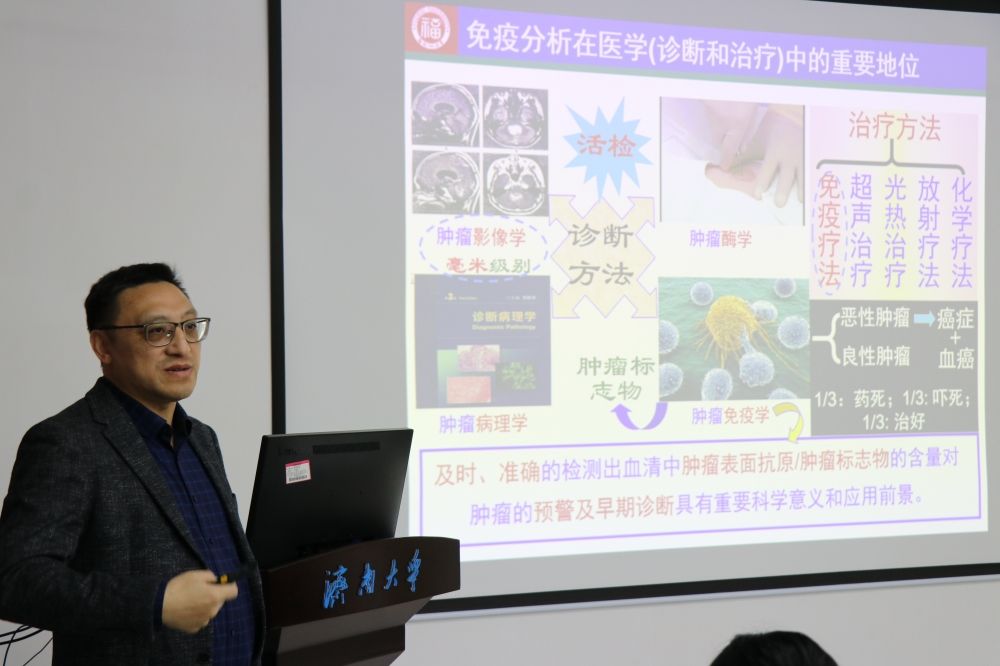 唐點平教授以“免疫分析新方法和新技術”為題,介紹了其課題組近年來在免疫分析領域的成果。唐點平教授指出,全球癌癥新發(fā)病例數(shù)量呈逐年上升趨勢,癌癥的早期診斷意義重大,而免疫分析在醫(yī)學診療過程中占據(jù)關鍵地位?;诖?,唐點平教授課題組對經(jīng)典免疫分析模式中的抗體標記策略與信號轉(zhuǎn)導模式予以創(chuàng)新,成功研制出多種便攜式柔性生物傳感器件,并構建了具備無線藍牙監(jiān)測功能的柔性傳感器,應用于智慧醫(yī)療診斷領域。圍繞疾病早期診斷以及柔性傳感器件制備等相關問題,化學化工學院師生與唐點平教授展開了深入的研討交流。