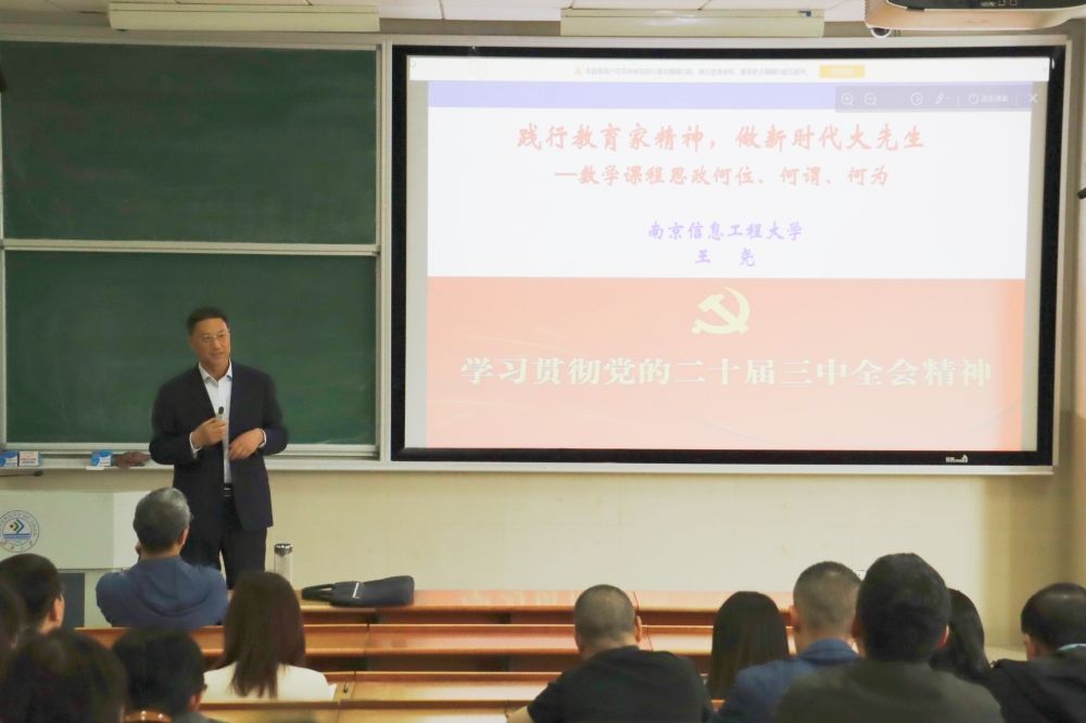 為貫徹落實立德樹人根本任務(wù),深入推動我院“課程思政”建設(shè)走深走實,全面提升人才培養(yǎng)質(zhì)量,5月6日下午,南京信息工程大學(xué)原黨委副書記、副校長,博士生導(dǎo)師王堯教授來院為師生作題為“弘揚教育家精神,做新時代大先生——數(shù)學(xué)課程思政何位、何謂、何為”的專題報告。學(xué)院全體領(lǐng)導(dǎo)班子成員及全體教職工參加會議,會議由學(xué)院黨委書記崔英靜主持。