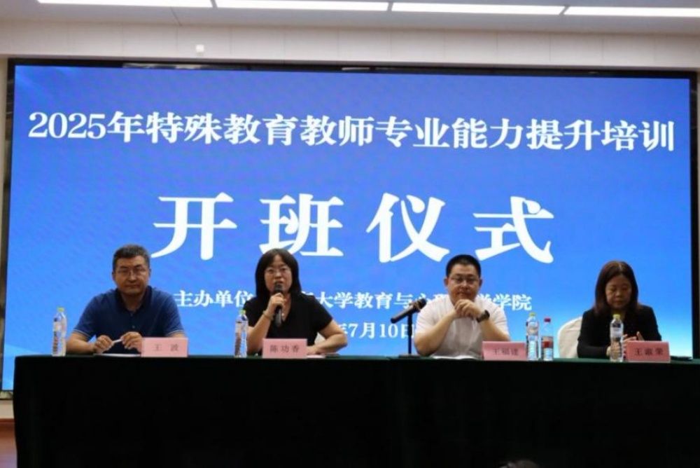 為全面提升山東省特殊教育教師專業(yè)素養(yǎng)與實踐能力,推動區(qū)域特殊教育高質(zhì)量發(fā)展。7月9日至13日,教育與心理科學(xué)學(xué)院在榮成市舉辦“特殊教育教師專業(yè)能力提升”專題培訓(xùn)班。來自全省各地的120余名特殊教育骨干教師齊聚一堂,共同參與此次培訓(xùn)。山東省教育科學(xué)研究院王福建部長、教育與心理科學(xué)學(xué)院院長陳功香、山東省特殊教育研究中心副主任王波等出席開班儀式并講話。