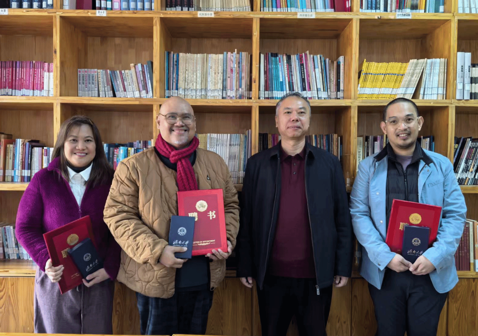 講座結(jié)束后,客人們興致勃勃地參觀了校園,濟南的初冬陽光和煦,帶給客人們賓至如歸的感覺。隨后在音樂學院舉行了客座教授聘任儀式,學院副院長王建成代表學院為Earl Clarence L. Jimenez教授、Lilymae F. Montano教授和Amiel Kim Quan Capitan教授頒發(fā)了聘書。王建成表示,三位教授的到訪為濟南大學音樂學院帶來了國際化的音樂教學理念與研究視角,有利于學院培養(yǎng)具有國際視野、跨文化交流能力和全球競爭力的人才,有利于提升學院的國際影響力和綜合實力,也為學院在非遺基地建設(shè)、傳統(tǒng)音樂研究、國際學術(shù)交流等方面注入新的動能。Earl Clarence L. Jimenez教授表示不虛此行,期待以此次合作為契機,推動菲律賓女子大學與濟南大學的深度交流與合作,在師生互訪、人才培養(yǎng)、學術(shù)研討等方面開展多層次的交流與合作。