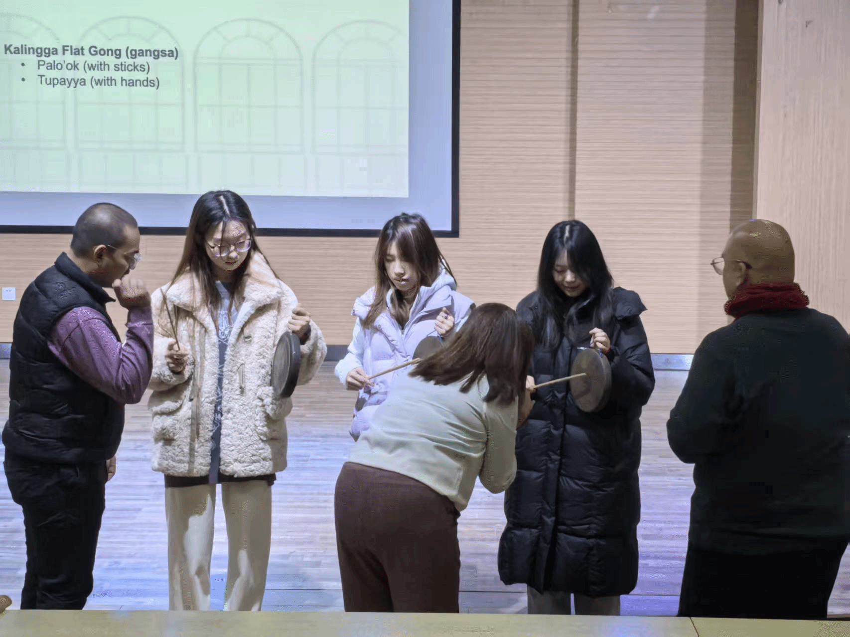 講座現(xiàn)場氣氛熱烈,三位教授分別從菲律賓傳統(tǒng)音樂的歷史淵源、地域特色、文化內(nèi)涵及傳承發(fā)展等方面展開深入講解,系統(tǒng)梳理了菲律賓呂宋島、米沙鄢群島、棉蘭老島三大區(qū)域傳統(tǒng)音樂的風格差異,詳細介紹了“庫林堂”“班杜拉”等極具菲律賓民族特色的傳統(tǒng)樂器的構(gòu)造與演奏技巧。在互動演示環(huán)節(jié),教授們現(xiàn)場演奏了《巴朗蓋民歌》《棉蘭老敘事曲》等多首菲律賓傳統(tǒng)音樂代表作,悠揚的旋律、獨特的節(jié)奏搭配特色樂器的演繹,讓師生們感受到了菲律賓傳統(tǒng)音樂的獨特韻味。隨后,在教授團的指導下,濟南大學音樂學院的同學們踴躍上臺,嘗試演奏菲律賓傳統(tǒng)樂器,親身體驗異域音樂的演奏技巧,教授們耐心細致地進行了一對一指導,現(xiàn)場氣氛熱烈,三位專家與現(xiàn)場師生共同探討了中菲音樂的特點,悅耳的音樂一旦響起就會跨越國界,成為文化的象征與友誼的使者,也給學院師生的教與學帶來了國際化的意識。