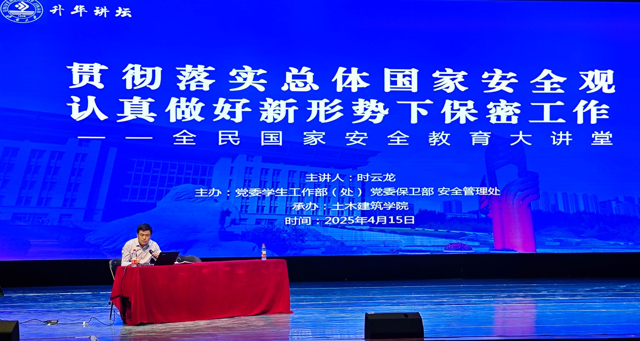 為深入貫徹落實習近平總書記關于國家安全和保密工作的重要論述,學習總體國家安全觀,加強全民國家安全教育,筑牢校園安全思想防線,4月15日,由黨委學生工作部(處)、黨委保衛(wèi)部 安全管理處 主辦,土木建筑學院承辦的升華講壇-全民國家安全教育大講堂在學校大禮堂舉行。濟南市委機要保密局技術中心業(yè)務二室副主任時云龍受邀作專題授課。黨委保衛(wèi)部 安全管理處 部(處)長李榮光主持活動,各單位涉密人員、各學院學生代表及土木建筑學院全體師生參加了活動。