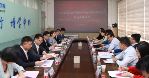 4月25日下午,外國(guó)語學(xué)院與山東省貿(mào)促會(huì)貿(mào)投部聯(lián)合開展以“黨建引領(lǐng)促發(fā)展,合作交流譜新篇”為主題的黨建共建活動(dòng)。本次活動(dòng)由山東省貿(mào)促會(huì)黨組成員、副會(huì)長(zhǎng)賀忠軍,省貿(mào)促會(huì)貿(mào)投部黨支部書記、部長(zhǎng)馬家峰,組織委員、副部長(zhǎng)徐勇等一行8人參加,外國(guó)語學(xué)院黨政領(lǐng)導(dǎo)班子和大外第二黨支部全體黨員參加。
