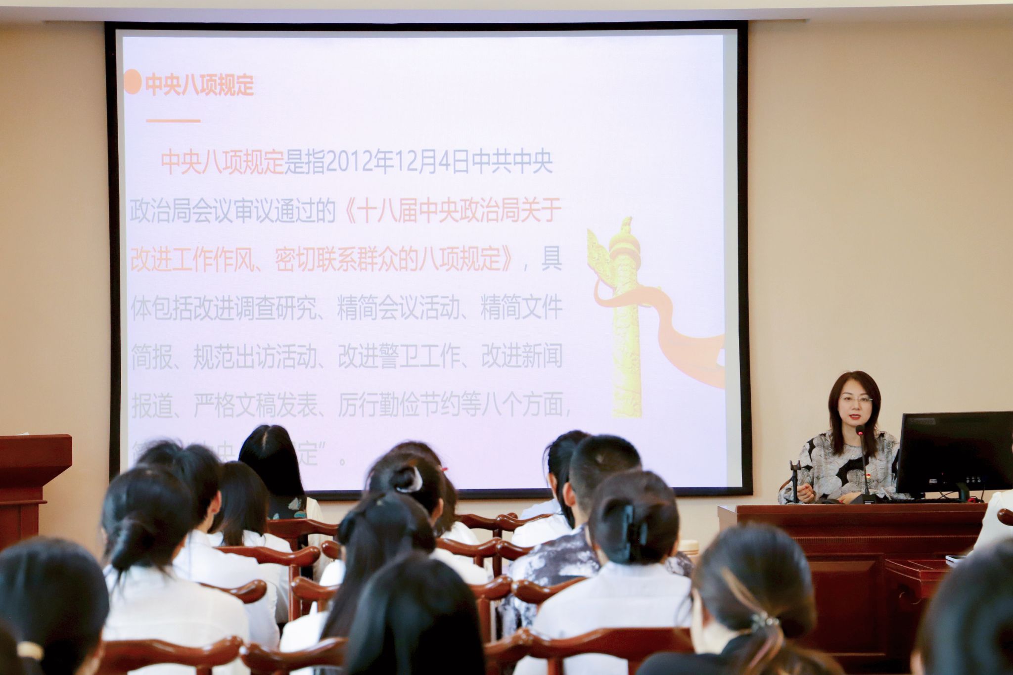 潘穎以《弘揚好作風 奮進新征程——讓中央八項規(guī)定精神成為自覺遵循》為主題,為畢業(yè)生黨員講授專題黨課。她闡釋了中央八項規(guī)定精神的核心要義與實踐要求,并針對畢業(yè)生黨員即將繼續(xù)從業(yè)從學的特點,講述學生黨員應如何落實中央八項規(guī)定精神,強調(diào)了畢業(yè)生步入社會之后廉潔從業(yè)的重要性。她寄語畢業(yè)生黨員要始終牢記黨員身份,堅定理想信念,扣好廉潔從業(yè)的“第一粒扣子”,將個人理想融入國家發(fā)展大局;要以信念鑄魂、以規(guī)矩為尺、以擔當力行,在新時代新征程中乘風破浪、行穩(wěn)致遠。