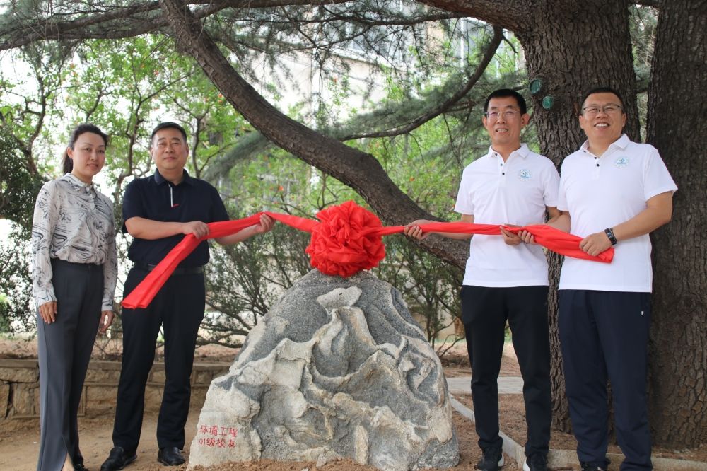 活動伊始,校友們齊聚九教樓前,舉行泰山石捐贈儀式。合作發(fā)展處副處長、校友工作辦公室副主任景麗萍,水利與環(huán)境學(xué)院黨委書記王義,校友代表劉慶、張慶智共同為景觀揭幕。