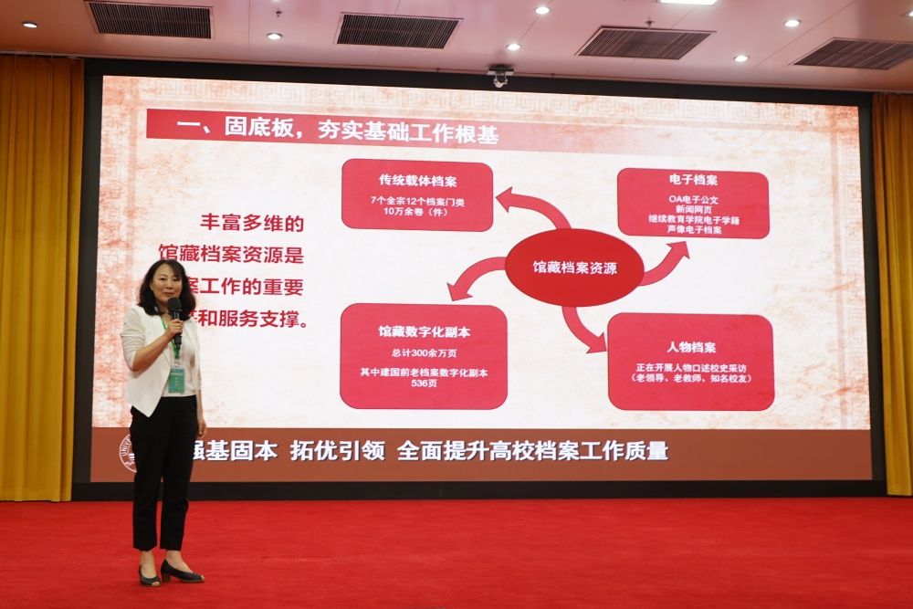 會議以“人工智能與數(shù)字轉型:高校檔案管理現(xiàn)代化與全域服務能力提升”為主題,安徽大學馬仁杰教授、吉林大學張衛(wèi)東教授作專家報告。省內6所高校圍繞著高質量檔案與校史工作實踐、檔案工作提質增效的實踐探索等內容作經(jīng)驗交流發(fā)言。會上,董潔從固底板夯實基礎工作根基、拓優(yōu)勢創(chuàng)新驅動特色發(fā)展、強引領黨建賦能業(yè)務提質、重育人讓檔案“發(fā)好聲、傳強聲、留余聲”等四個方面分享了我校檔案館(校史館)的工作經(jīng)驗。她重點介紹了我校檔案治理體系、資源體系、利用體系、安全體系等“四個體系”建設情況,特別是在數(shù)智時代充分利用信息化手段全面提升檔案工作質量的實踐與探索。
