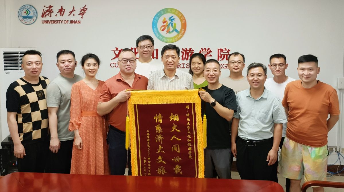 座談會(huì)上,校友們逐一分享了畢業(yè)后的工作經(jīng)歷和人生感悟。并向?qū)W院贈(zèng)送了一面寫有“煙火人間廿載,情系濟(jì)大文旅”的錦旗,表達(dá)對(duì)母校和老師們的感激之情。校友們紛紛表示,無(wú)論走到哪里,烹高021班的同學(xué)們始終以母校為榮,并將繼續(xù)關(guān)注和支持學(xué)院的發(fā)展。孟德洋代表學(xué)院接受錦旗,并為校友們贈(zèng)送了學(xué)院精心準(zhǔn)備的紀(jì)念品,希望校友們永遠(yuǎn)銘記母校的培育之恩,在未來(lái)的人生道路上繼續(xù)砥礪前行。