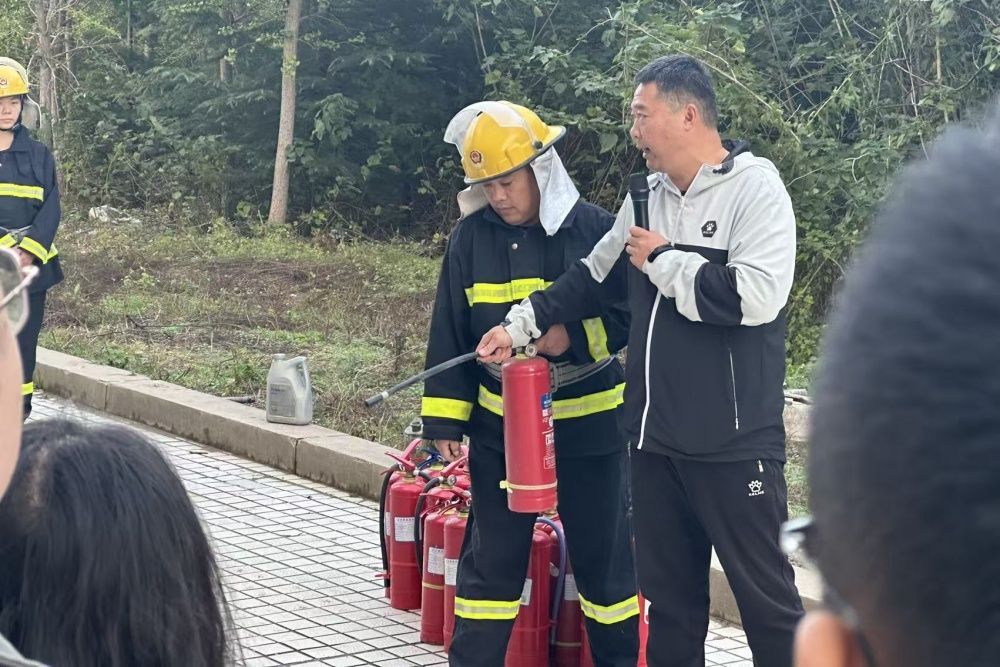 在滅火實(shí)戰(zhàn)演練環(huán)節(jié),李鵬講解的同時(shí)消防保安員進(jìn)行示范:手持干粉滅火器,清晰拆解“提瓶——拔銷(xiāo)——握管—壓閥——對(duì)準(zhǔn)火焰根部噴射”五步操作法,對(duì)“站立上風(fēng)向滅火”“滅火后檢查復(fù)燃隱患”等細(xì)節(jié)反復(fù)強(qiáng)調(diào)。隨后,新教師分組上陣實(shí)操,大家沉著按照流程操作,從最初的稍顯緊張到逐漸熟練,紛紛成功撲滅“火情”。