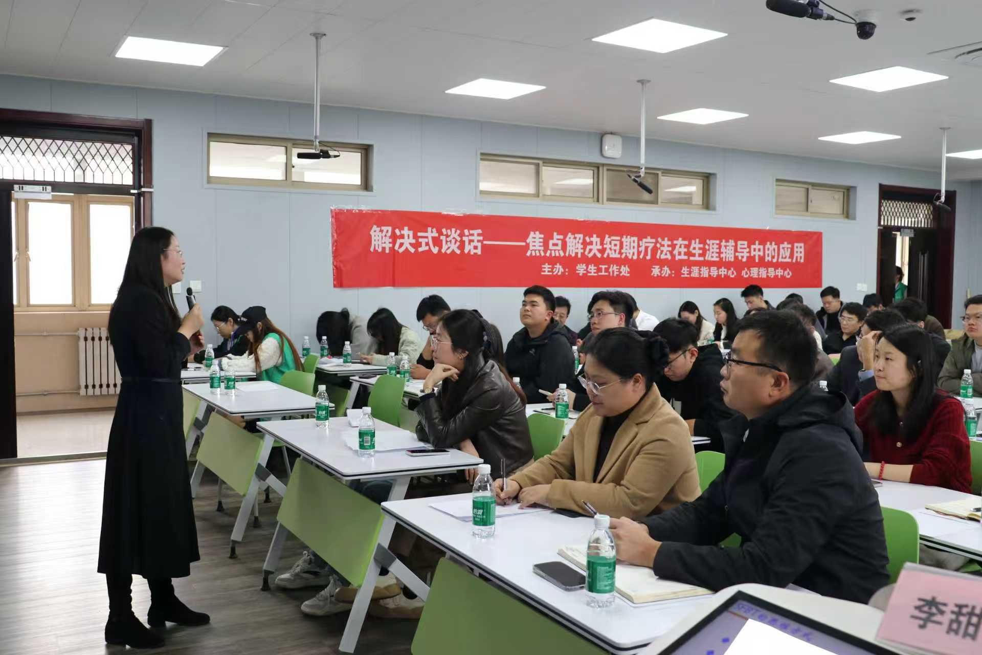 為進一步提升輔導員生涯輔導技能,提高生涯指導質量,10月29日,學校舉辦“解決式談話——焦點解決短期療法在生涯輔導中的應用”專題培訓。培訓由學生工作處主辦,生涯指導中心、心理指導中心承辦,邀請山東師范大學教育學部副教授、碩士生導師李甜甜做專題報告,學生工作處副處長張晶主持培訓,各學院生涯輔導員、生涯發(fā)展指導工作室成員、近三年新進輔導員、心理專職教師等參加培訓。