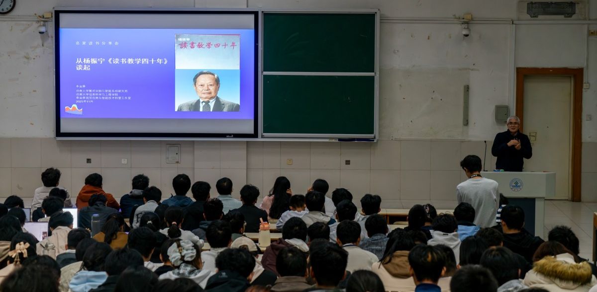 隨后,李金屏教授以楊振寧院士的著作《讀書(shū)教學(xué)四十年》為切入點(diǎn),圍繞“勿忘歷史,珍惜當(dāng)下;好好學(xué)習(xí),報(bào)效祖國(guó)”的主題,為在場(chǎng)師生帶來(lái)了一場(chǎng)內(nèi)容豐富、啟迪深刻的分享。李教授結(jié)合自身求學(xué)與科研工作的親身經(jīng)歷,分享了獨(dú)到的讀書(shū)心得與人生感悟,并就學(xué)業(yè)規(guī)劃與個(gè)人成長(zhǎng)為同學(xué)們提供了切實(shí)可行的指導(dǎo),現(xiàn)場(chǎng)反響熱烈。