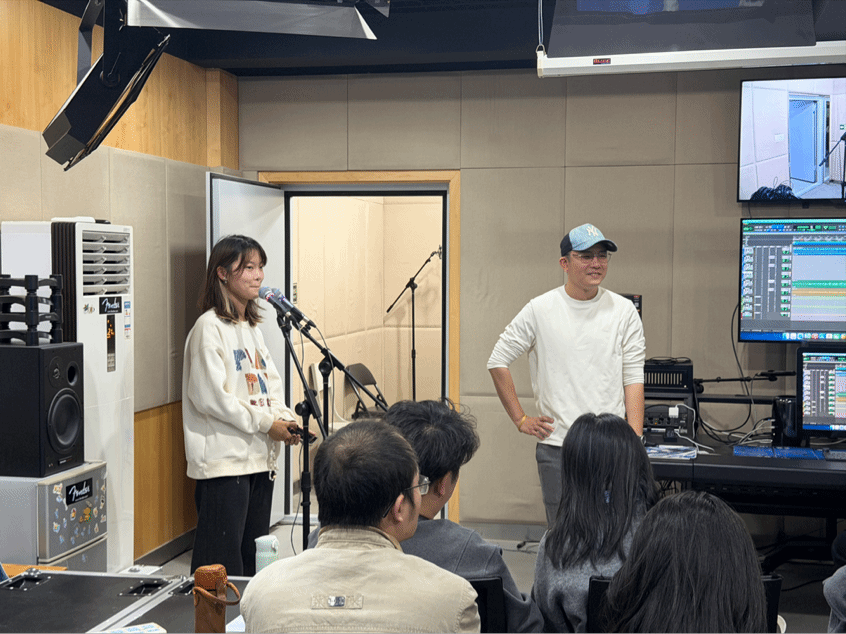 講座開始前,王建成對張?zhí)礻柕牡絹肀硎練g迎,簡要介紹了學校美育、社會美育、群眾美育的內在聯系,督促大家積極投身到群眾美育的熱潮之中,從莊戶劇團、小劇小戲等汲取靈感,把自身的專業(yè)優(yōu)勢轉化為美育優(yōu)勢。隨后,張?zhí)礻柦Y合個人職業(yè)發(fā)展經歷從錄音核心要素等實用話題切入,提出錄音人聲判定的四大核心維度——“SPEECH、MIX、TWANG、BELT”,為在場師生搭建起人聲錄音的認知框架。為讓錄音理論的講解更易落地,他特別邀請政法學院同學擔任素人歌手進行采樣示范,聚焦非專業(yè)素人錄音的關鍵技巧展開細致講解。針對素人錄音常見痛點,張?zhí)礻柗窒砹巳蠛诵姆椒ǎ阂皇峭ㄟ^語言溝通破冰演唱者與錄音師的屏障,幫助演唱者正確把握演唱狀態(tài),同時根據演唱者實時表現靈活適配設備;二是采用故事講述法與個人情緒調節(jié)技巧,幫助演唱者為作品注入真摯情感;三是展示返聽設備對錄音工作的重要性,直觀呈現設備對演唱效果的實際影響。