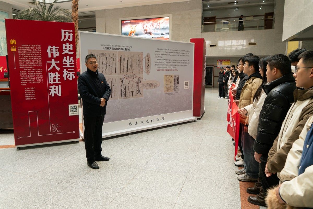 在濟南戰(zhàn)役史實展現(xiàn)場,學院黨委書記夏衛(wèi)東為全體師生黨員講授專題黨課。他強調(diào),銘記黨史、緬懷先烈是黨員的必修課,大家要深刻領(lǐng)悟紅色歷史中蘊含的精神力量,在思想上持續(xù)淬煉提升,在行動上主動擔當作為,以實干實績響應時代號召。隨后,在講解員的帶領(lǐng)下,依次參觀了“偉大勝利 歷史坐標”“運籌帷幄 劍指濟南”“八天八夜 鏖戰(zhàn)古城”“攻堅之戰(zhàn) 決勝密碼”等八大主題展區(qū),展板上的史料圖片,生動再現(xiàn)了濟南戰(zhàn)役的戰(zhàn)略部署、隱蔽戰(zhàn)線、人民支前等情景,全體師生黨員駐足在烈士名錄與資料圖片前,深切緬懷革命先輩的英雄事跡。