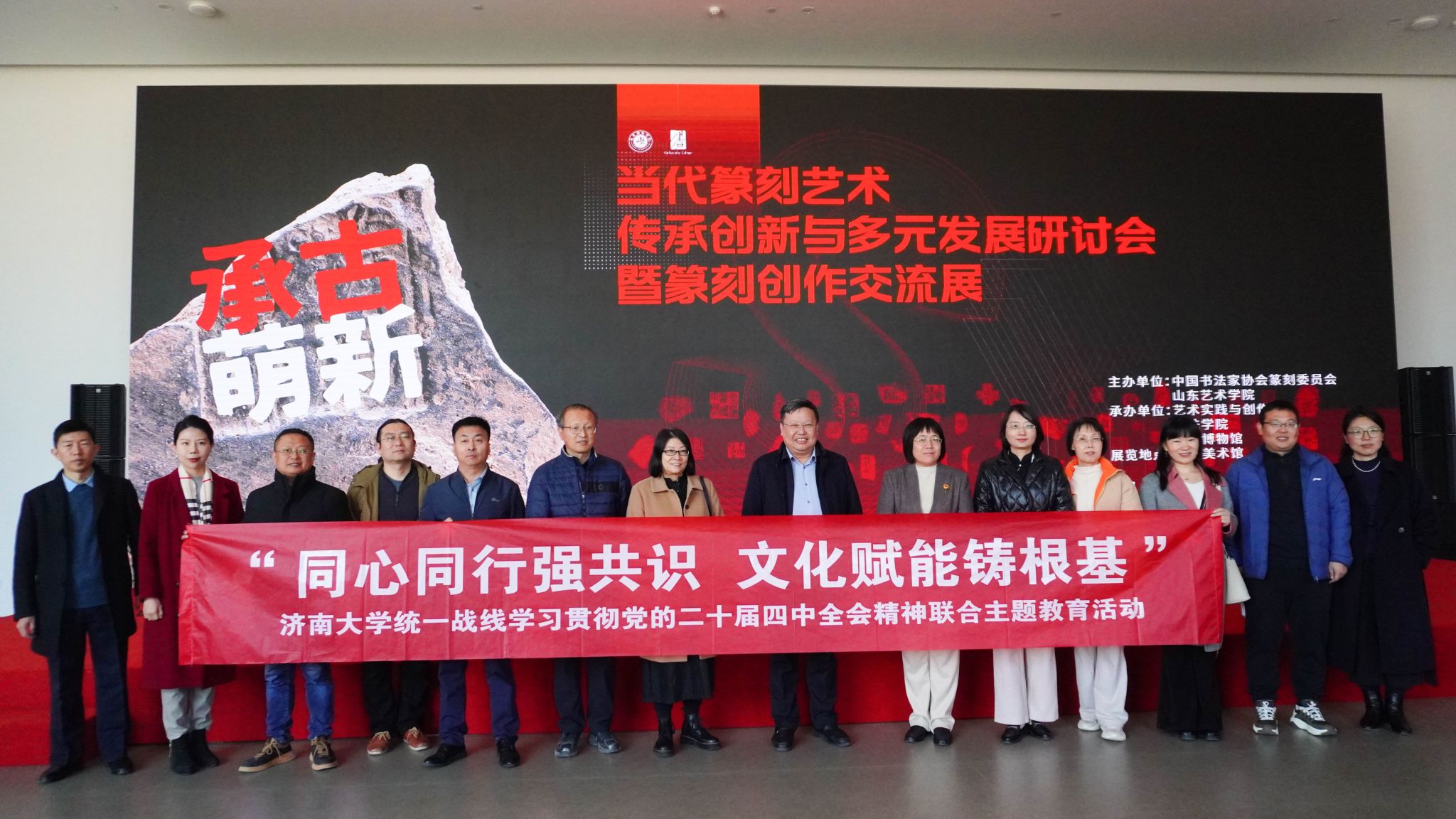 為深入學(xué)習(xí)貫徹黨的二十屆四中全會(huì)精神,凝聚統(tǒng)一戰(zhàn)線思想共識(shí),以優(yōu)秀傳統(tǒng)文化賦能學(xué)校高質(zhì)量發(fā)展,11月21日上午,學(xué)校黨委統(tǒng)戰(zhàn)部聯(lián)合美術(shù)與設(shè)計(jì)學(xué)院,組織各民主黨派、統(tǒng)戰(zhàn)團(tuán)體代表赴山東藝術(shù)學(xué)院長(zhǎng)清校區(qū)開展“同心同行強(qiáng)共識(shí) 文化賦能鑄根基”學(xué)習(xí)貫徹黨的二十屆四中全會(huì)精神聯(lián)合主題教育活動(dòng)。山東藝術(shù)學(xué)院黨委書記徐梅,黨委委員、副院長(zhǎng)蘇茂興,學(xué)校黨委常委、統(tǒng)戰(zhàn)部部長(zhǎng)徐慶國,美術(shù)與設(shè)計(jì)學(xué)院黨委書記陳春鋒出席,兩校各民主黨派、統(tǒng)戰(zhàn)團(tuán)體代表,相關(guān)部門負(fù)責(zé)人參加。