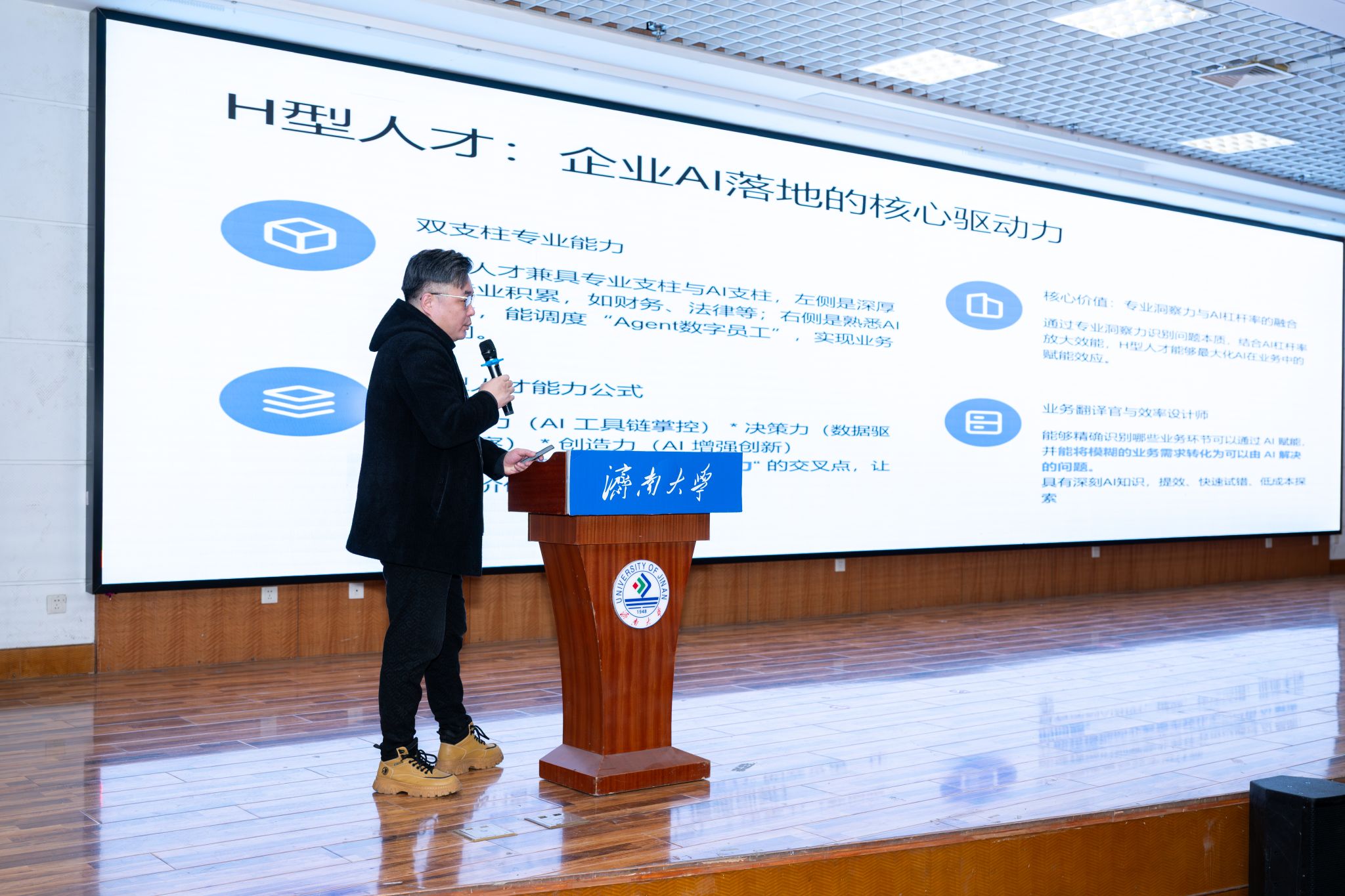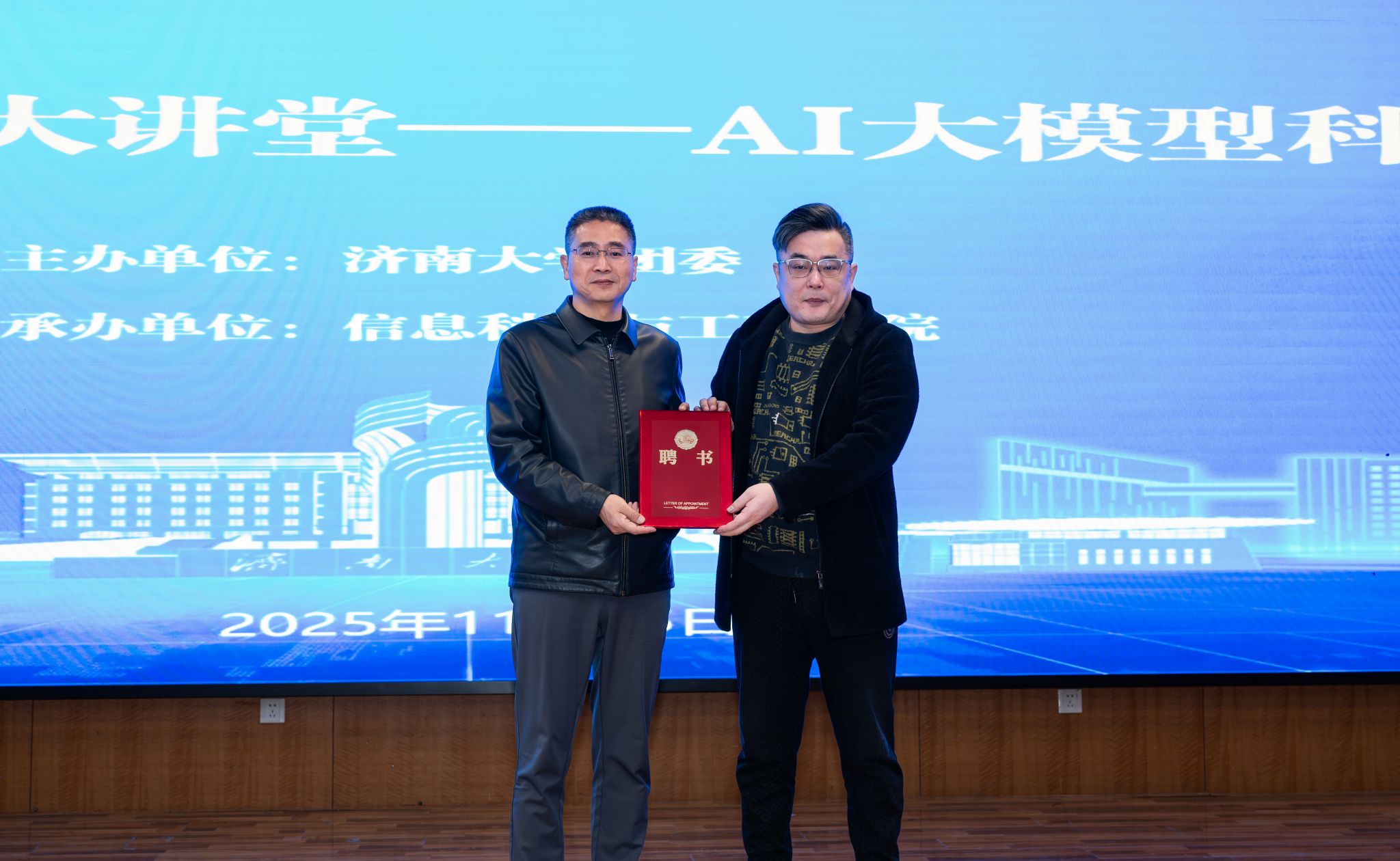 李書翔對(duì)王海寧及在場(chǎng)師生的到來表示歡迎,并簡(jiǎn)單介紹了學(xué)校團(tuán)委“泉城大講堂”活動(dòng)情況。他指出,人工智能技術(shù)正以前所未有的力量重塑世界格局,驅(qū)動(dòng)產(chǎn)業(yè)變革,展現(xiàn)出廣闊的發(fā)展前景和巨大的賦能潛力。他希望同學(xué)們以本次講座為契機(jī),一要心懷“國(guó)之大者”,將個(gè)人興趣與國(guó)家戰(zhàn)略緊密結(jié)合,樹立科技報(bào)國(guó)志向;二要勇于探本溯源,構(gòu)建跨學(xué)科知識(shí)體系,增強(qiáng)面向未來的核心競(jìng)爭(zhēng)力;三要勤于知行合一,積極參與創(chuàng)新創(chuàng)業(yè)實(shí)踐,將知識(shí)轉(zhuǎn)化為解決問題的能力,為科技強(qiáng)國(guó)建設(shè)貢獻(xiàn)青春力量。