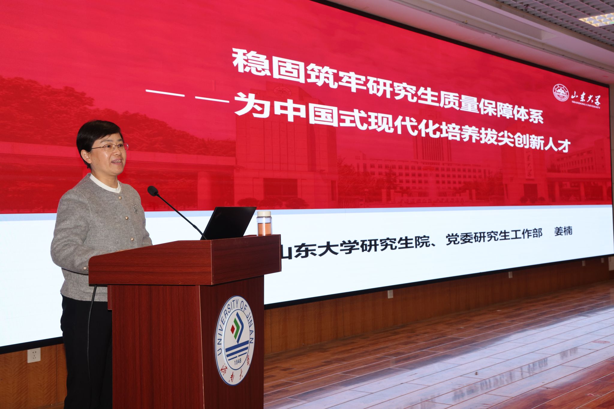 姜楠教授以“穩(wěn)固筑牢研究生質(zhì)量保障體系——為中國(guó)式現(xiàn)代化培養(yǎng)拔尖創(chuàng)新人才”為題,圍繞國(guó)家研究生教育改革政策導(dǎo)向與實(shí)踐路徑,尤其是我校關(guān)注的學(xué)科交叉、工程碩博士改革、學(xué)位論文分類評(píng)閱等方面展開深度解讀。她結(jié)合山東大學(xué)研究生教育管理經(jīng)驗(yàn),從山東大學(xué)工作概況、學(xué)位授權(quán)點(diǎn)建設(shè)、導(dǎo)師隊(duì)伍建設(shè)、學(xué)位授予質(zhì)量提升、學(xué)位論文分類評(píng)閱五個(gè)維度為濟(jì)南大學(xué)研究生院管理及教育教學(xué)改革提供了重要參考。