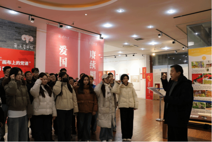 走進展覽館,師生們創(chuàng)作的中國畫、油畫、版畫、水彩(水粉)、綜合材料以及書法篆刻等百余件精品,讓“一二·九”運動歷史場景、愛國主義精神立體化呈現(xiàn)在我們面前,在講解員精彩講述下,分別參觀學(xué)習(xí)了“山河危局·歷史回響”“精神永續(xù)·青春向上”“砥礪奮進·自信自強”三個單元,展覽中統(tǒng)一的藝術(shù)敘事中貫通歷史記憶與時代畫卷,讓我們深刻感受到“一二·九”斗爭精神的偉大和沉重,同時激勵黨員們在新時代發(fā)展中堅定理想信念、厚植家國情懷、投身強國建設(shè)。