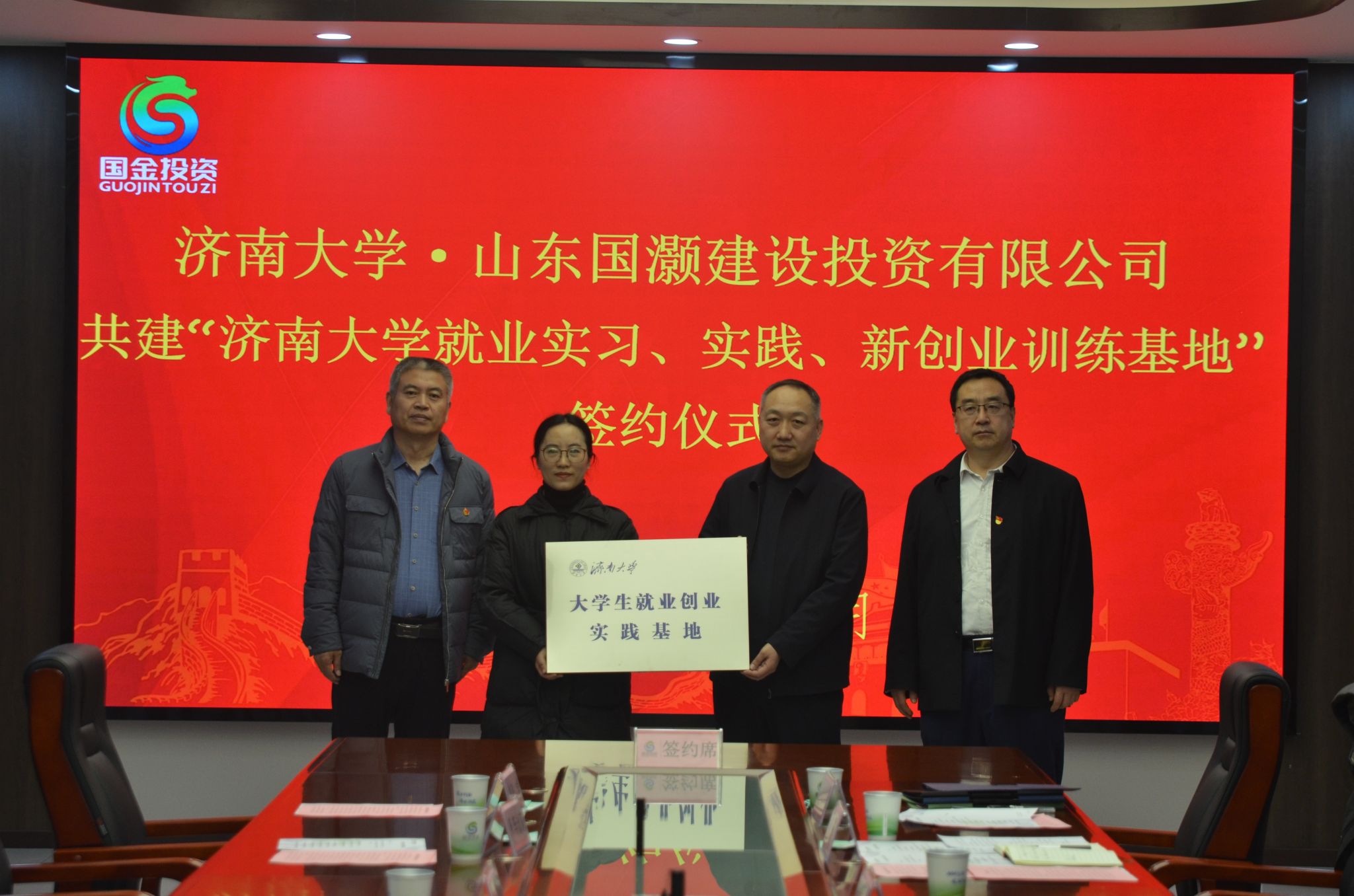 李健慧與國(guó)金投資集團(tuán)投資發(fā)展部部長(zhǎng)、山東國(guó)灝建設(shè)投資有限公司總經(jīng)理連永簽訂“濟(jì)南大學(xué)就業(yè)實(shí)習(xí)基地”和“濟(jì)南大學(xué)就業(yè)創(chuàng)業(yè)實(shí)習(xí)基地”合作協(xié)議,并共同為實(shí)習(xí)基地揭牌。