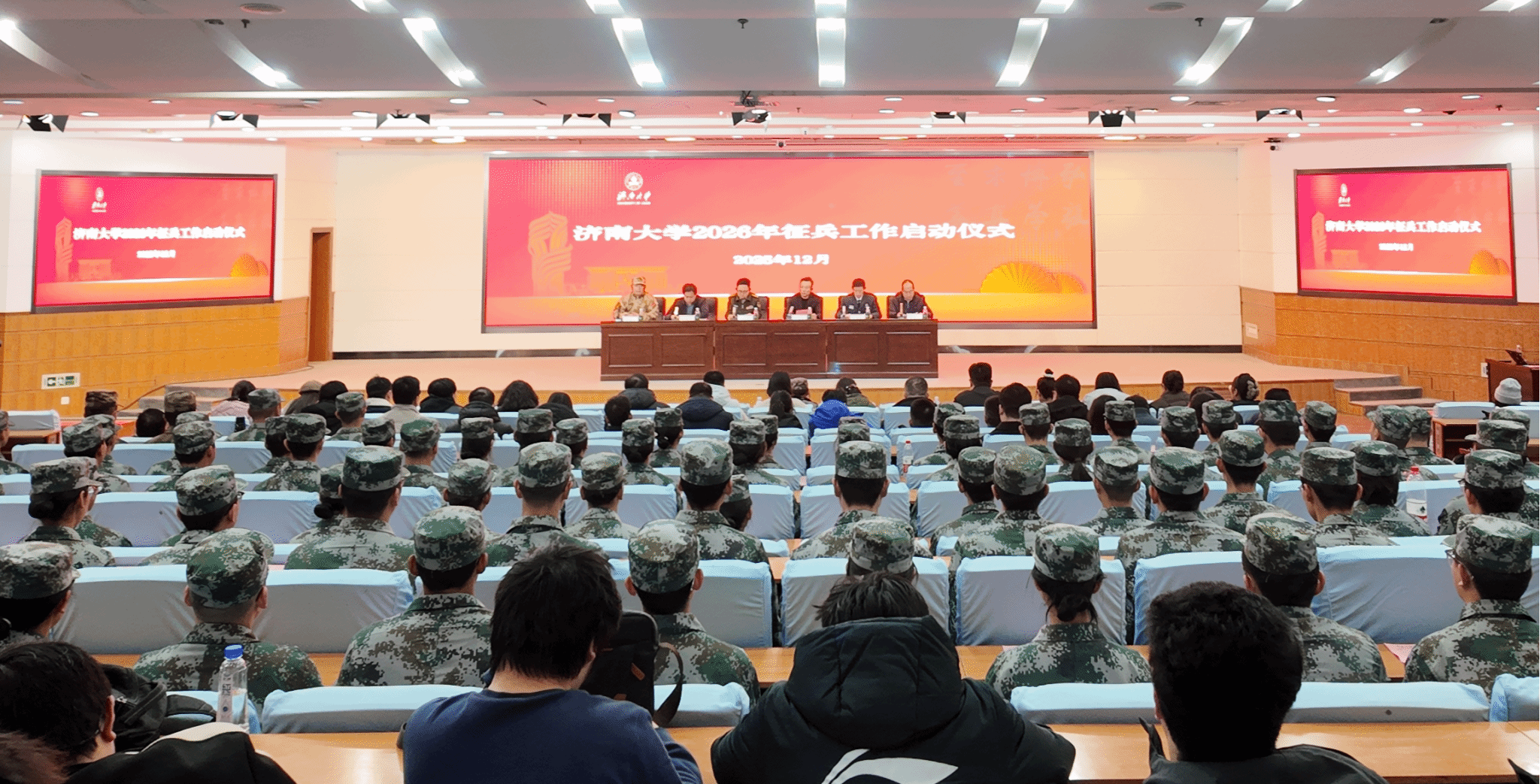為號(hào)召全校有志青年積極響應(yīng)祖國(guó)召喚,投身綠色軍營(yíng),用熱血和擔(dān)當(dāng)書寫無(wú)悔青春,12月26日下午,學(xué)校在第一報(bào)告廳舉行2026年征兵工作啟動(dòng)儀式。學(xué)校人民武裝部部長(zhǎng)胡春毅做動(dòng)員講話,濟(jì)南市市中區(qū)武裝部副部長(zhǎng)肖梓博、市中區(qū)退役軍人事務(wù)局亓慶勇、各學(xué)院武裝工作負(fù)責(zé)人、畢業(yè)生輔導(dǎo)員、征兵政策宣講員、翼虎和風(fēng)暴“兵員儲(chǔ)備連”全體人員及畢業(yè)班學(xué)生代表300余人參加,活動(dòng)由學(xué)校人民武裝部副部長(zhǎng)董俊杰主持。