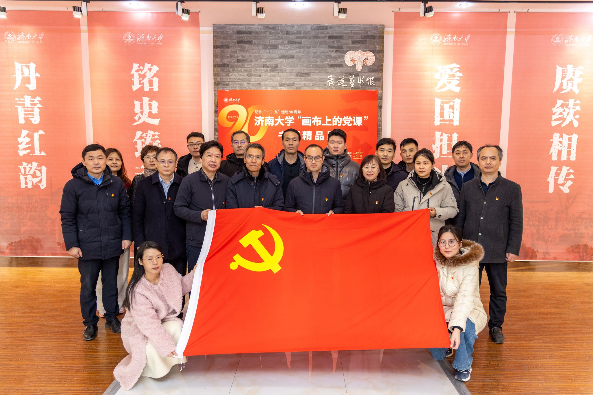 第二階段,全體人員前往舜道藝術館參觀“畫布上的黨課”書畫精品展。此次展覽以“丹青紅韻、銘史鑄魂、愛國擔當、賡續(xù)相傳”為主題,分為“山河危局·歷史回響”“精神永續(xù)·青春向上”“砥礪奮進·自信自強”三個單元。通過一幅幅主題鮮明、筆墨精湛的書畫作品,生動再現(xiàn)了“一二·九”運動歷史場景、愛國主義精神賡續(xù)弘揚以及新時代中國式現(xiàn)代化建設火熱實踐。黨員們在作品前駐足凝視、交流感悟,深刻領會“一二?九”運動的歷史意義和時代價值,進一步堅定了理想信念,凝聚了傳承紅色基因、勇?lián)耸姑木窳α俊?/p>