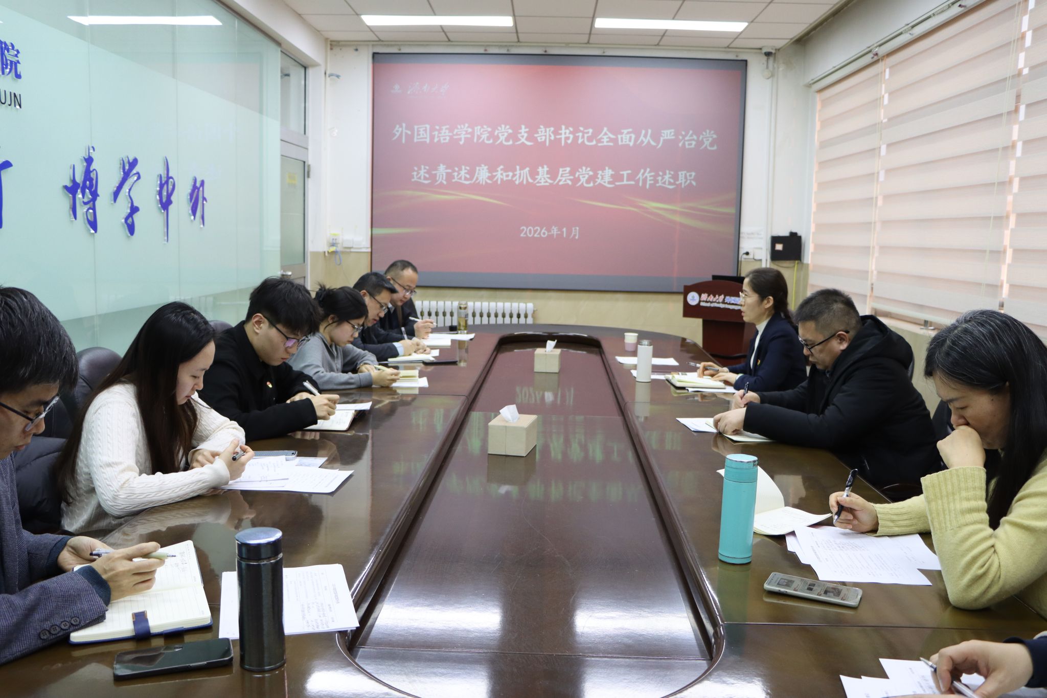 郭英對各黨支部書記的述職情況逐一進(jìn)行了點評。她充分肯定了過去一年各黨支部所取得的工作成績和亮點業(yè)績,并就存在問題提出了四點要求:一是深化理論學(xué)習(xí),創(chuàng)新學(xué)習(xí)形式。通過聯(lián)建共建、實地調(diào)研等方式,拓寬學(xué)習(xí)路徑,提升學(xué)習(xí)實效。二是夯實組織建設(shè),激發(fā)組織活力。推進(jìn)黨建與學(xué)生工作、教師提升、學(xué)院發(fā)展深度融合,開展思政示范課、“紅色外語”“多語譯廉”等特色工程。三是打造特色品牌,加大宣傳力度。深化“一支部一特色” 建設(shè),加大典型事跡挖掘與宣傳力度,提高支部工作的辨識度和影響力。四是抓實廉政教育,筑牢廉潔防線,持續(xù)開展廉政警示教育,以實際行動助力清廉校園建設(shè)。