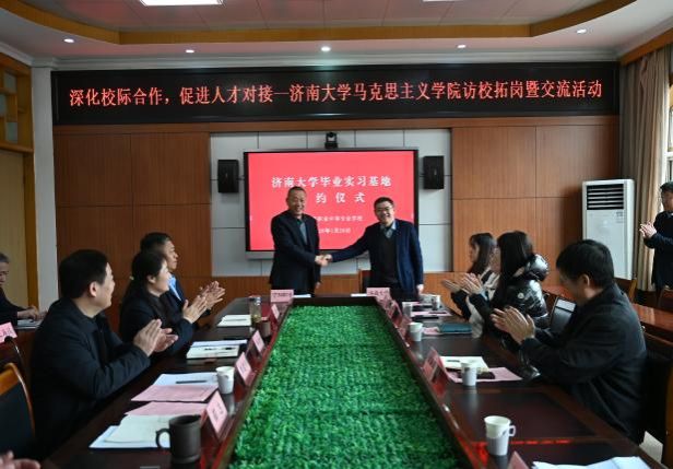 在寧陽職業(yè)中專,學(xué)院代表團(tuán)實(shí)地考察校園,并就辦學(xué)定位、專業(yè)發(fā)展及思政教育實(shí)踐進(jìn)行交流。雙方聚焦大中小學(xué)思政課一體化建設(shè)、師資培訓(xùn)、課程資源共享等議題深入探討。楊立志院長表示,學(xué)院將積極發(fā)揮高校資源作用,支持對(duì)方在思政課程建設(shè)與教師能力提升方面的需求?;顒?dòng)中,雙方簽署了合作協(xié)議,并為“濟(jì)南大學(xué)就業(yè)實(shí)習(xí)基地”揭牌,標(biāo)志著校校合作進(jìn)入實(shí)質(zhì)性推進(jìn)階段。