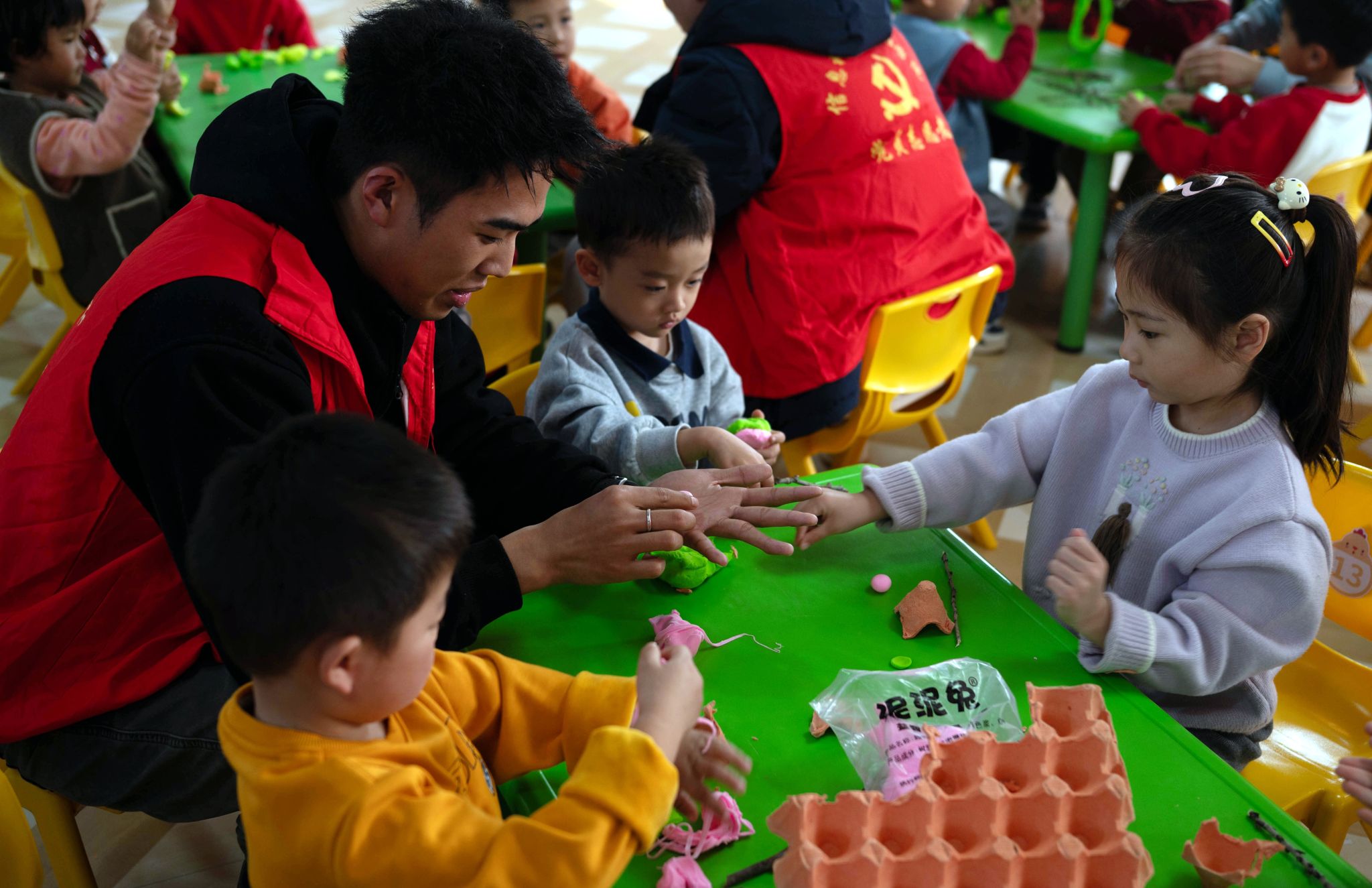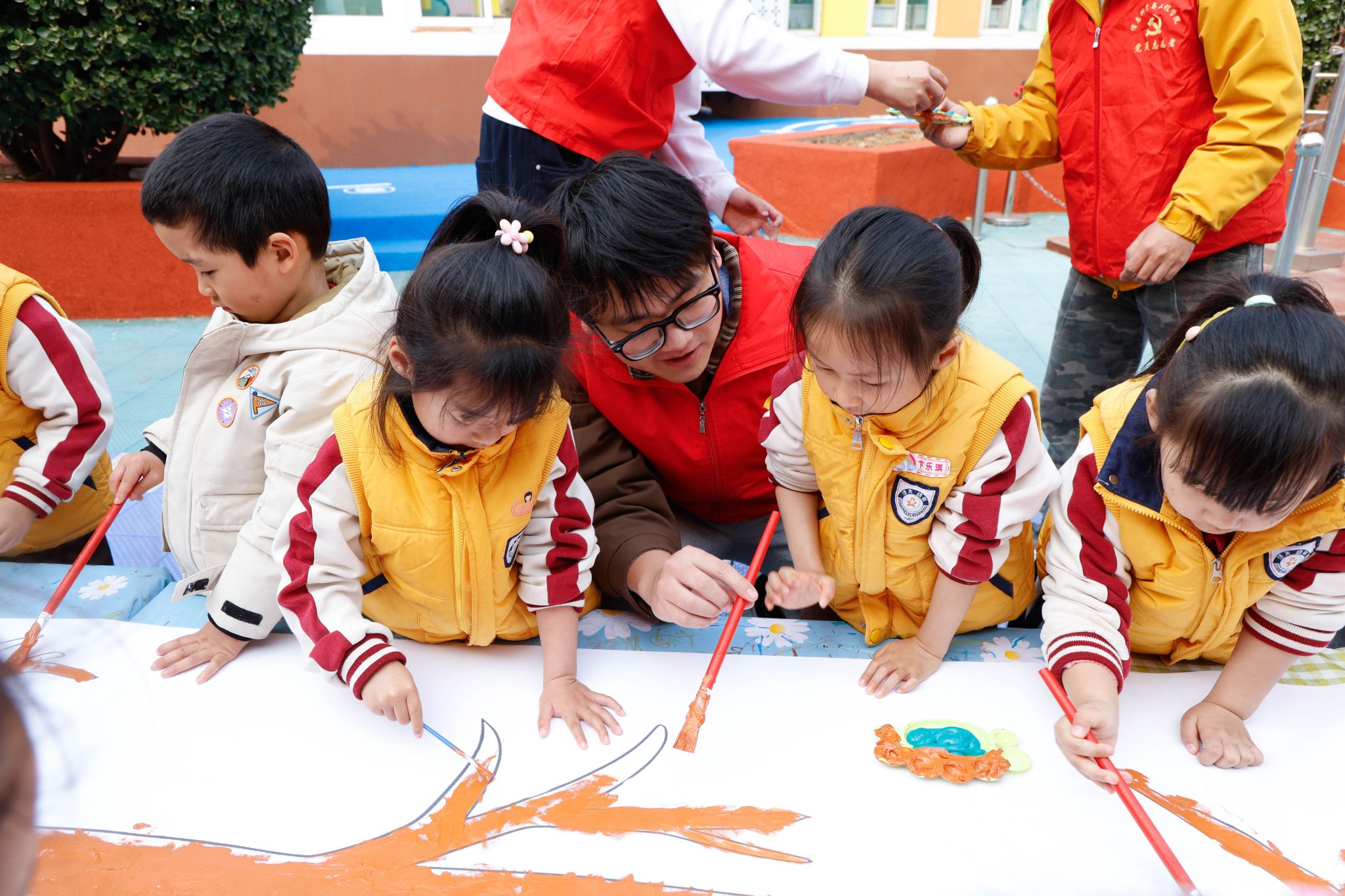 除了戶外的體力勞動(dòng),志愿者們還走入教室,通過多元化的美育課程激發(fā)幼兒的創(chuàng)造力。在“變廢為寶”環(huán)節(jié),志愿者引導(dǎo)小朋友將廢棄雞蛋托轉(zhuǎn)化為色彩斑斕的“創(chuàng)意盆栽”,配合彩泥捏制的綠葉與紅花,讓枯燥的廢料煥發(fā)了生機(jī)。在繪畫課堂上,志愿者們帶領(lǐng)孩子觀察春日色彩,以手掌為印章,在畫布上共同創(chuàng)作出繁茂的“大樹圖”。通過這種輕松愉快的藝術(shù)形式,志愿者們不僅有效鍛煉了幼兒的動(dòng)手能力與表達(dá)能力,也展現(xiàn)了青年學(xué)子的責(zé)任感與親和力。整場(chǎng)活動(dòng)節(jié)奏舒緩且充滿溫情,確保了每位幼兒都能在安全的環(huán)境中感受創(chuàng)造的快樂。