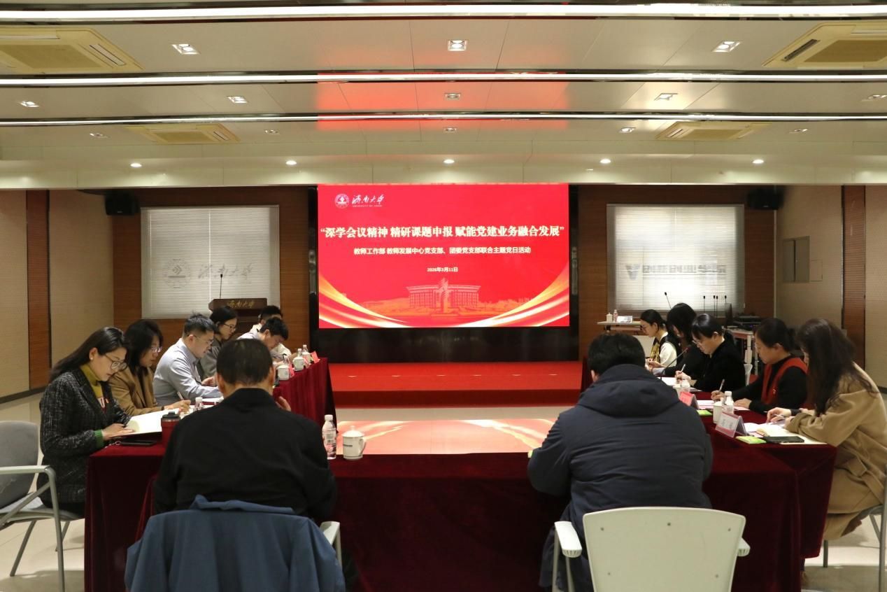 為深入學(xué)習(xí)貫徹學(xué)校四屆八次全委擴大會議精神,推動黨建與業(yè)務(wù)深度融合,3月11日,教師工作部 教師發(fā)展中心黨支部與團委黨支部聯(lián)合開展“深學(xué)會議精神 精研課題申報 賦能黨建業(yè)務(wù)融合發(fā)展”主題黨日活動。支部全體黨員和部分學(xué)院團干部參加活動,活動由教師工作部 教師發(fā)展中心黨支部書記張婷主持。