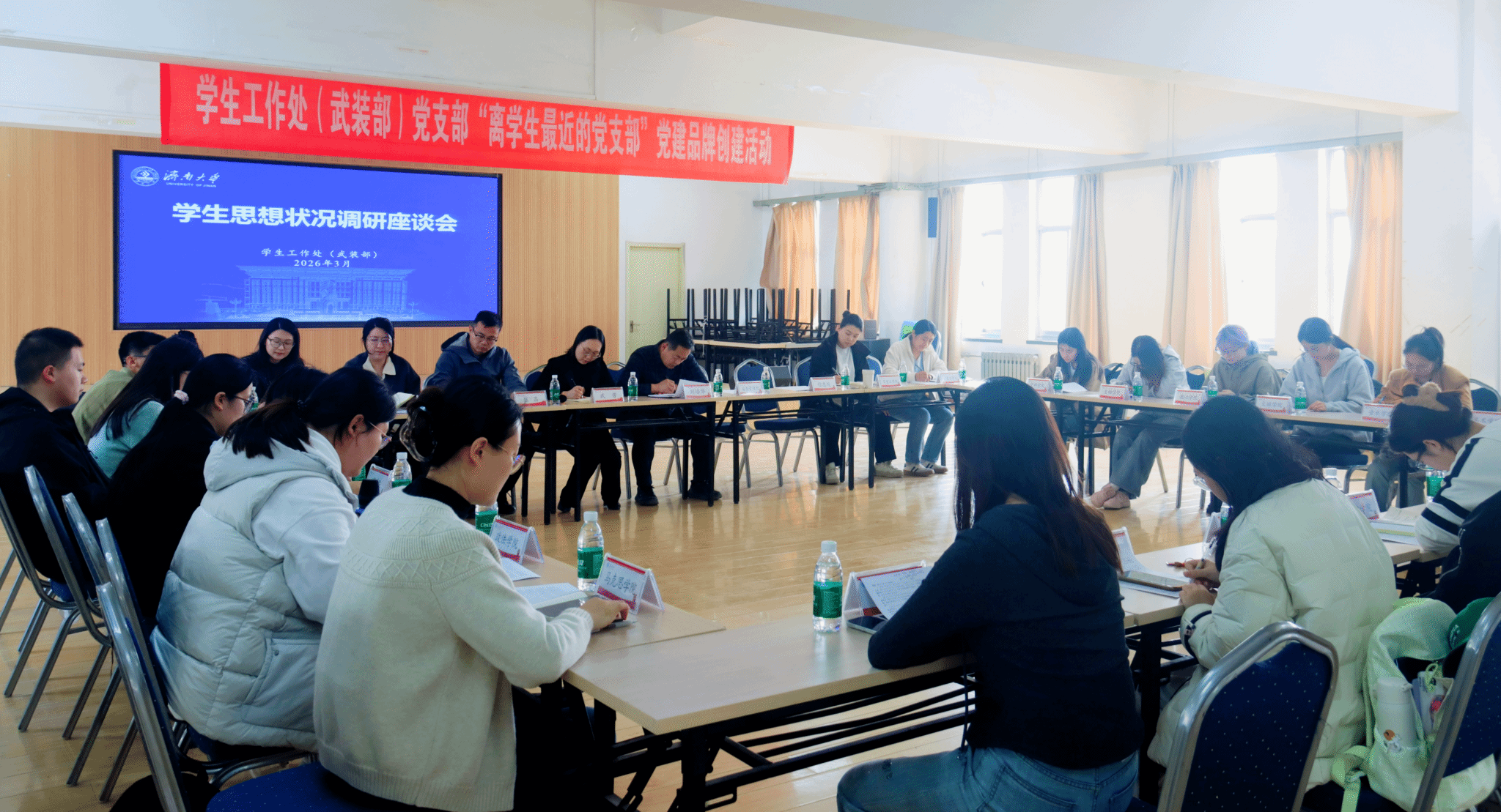 為進一步夯實思想政治教育工作基礎(chǔ),切實把握新學期學生思想動態(tài),精準了解學生實際需求,3月24日,學校召開學生思想狀況調(diào)研座談會。學生工作處(武裝部)、黨委保衛(wèi)部、后勤管理處、信息管理處、團委等部門相關(guān)負責同志以及21個學院學生代表參加會議,座談會由學生工作處(武裝部)副處長武芳主持。