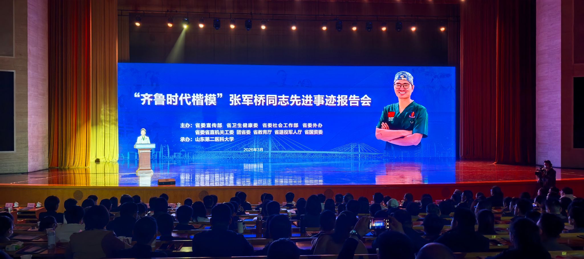 為深入落實(shí)立德樹(shù)人根本任務(wù),引導(dǎo)廣大師生堅(jiān)定理想信念、厚植家國(guó)情懷,3月25日上午,學(xué)校組織師生代表赴山東會(huì)堂參加由山東省委宣傳部、省衛(wèi)生健康委員會(huì)、省教育廳等9部門(mén)聯(lián)合舉辦的“齊魯時(shí)代楷模”張軍橋同志先進(jìn)事跡報(bào)告會(huì)。師生們?cè)隈雎?tīng)英雄故事、感悟榜樣力量中接受了一次深刻而生動(dòng)的精神洗禮。