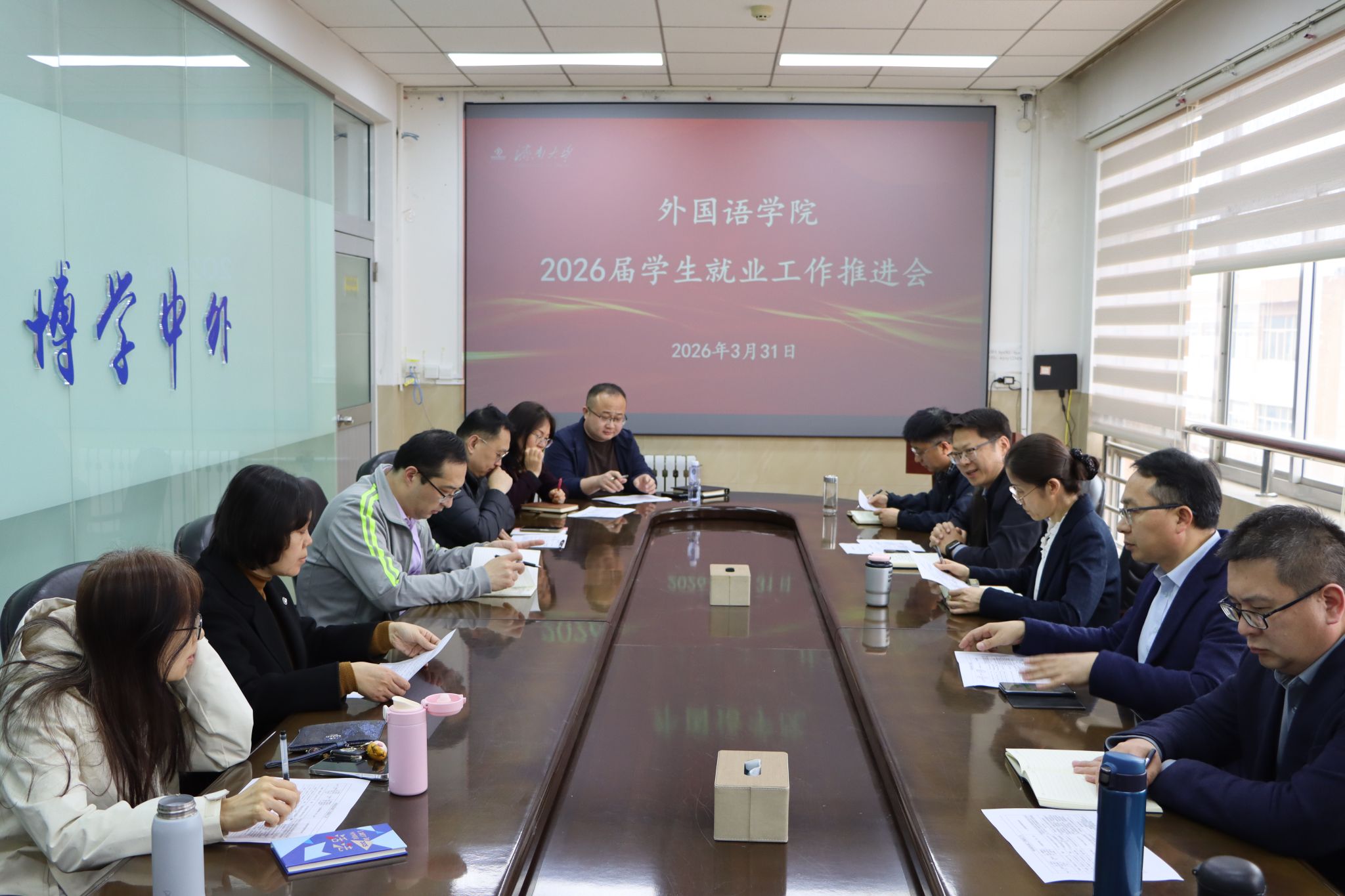 為扎實推動學院2026屆畢業(yè)生實現(xiàn)高質(zhì)量充分就業(yè),有效落實各項就業(yè)政策,3月31日下午,外國語學院在學院會議室召開2026屆畢業(yè)生就業(yè)工作推進會。學院黨政領導班子成員、各系主任、畢業(yè)班班主任及全體輔導員參加會議,會議由外國語學院黨委副書記、副院長李春海主持。