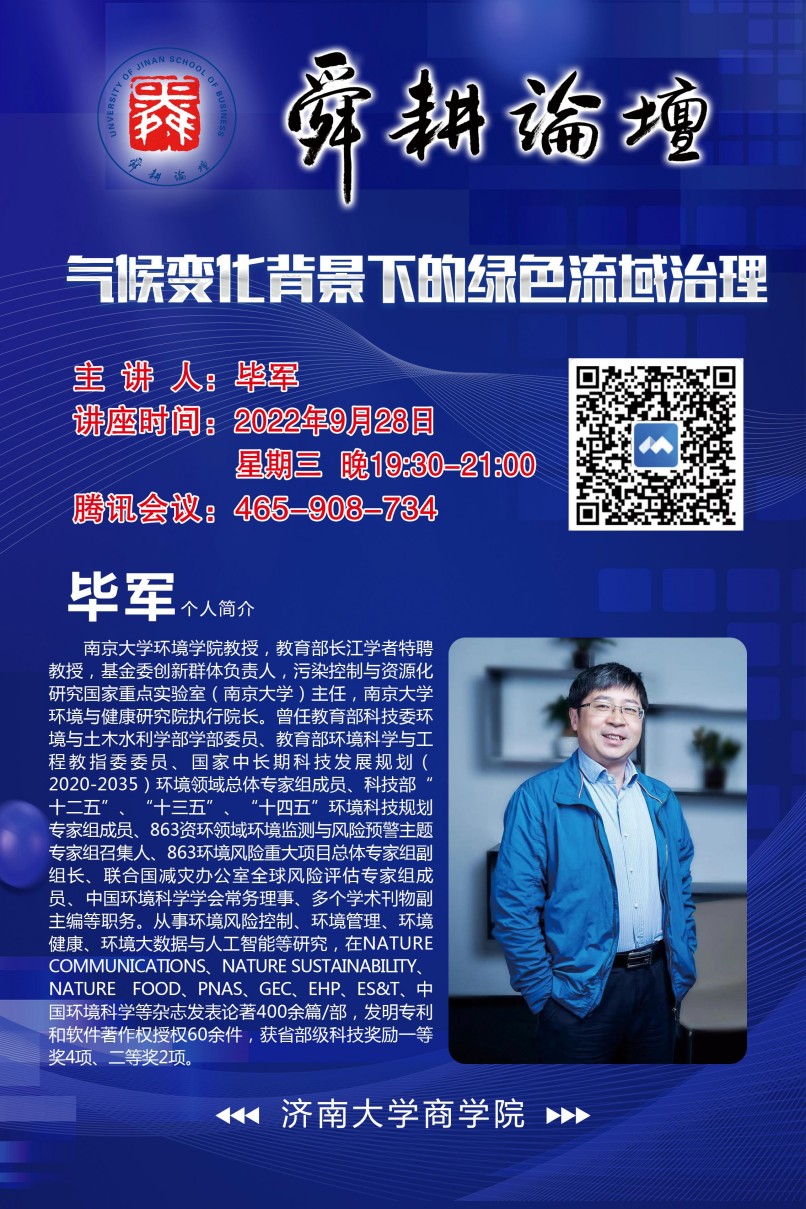 舜耕論壇本期邀請(qǐng)南京大學(xué)畢軍教授講座,主題是:氣候變化背景下的綠色流域治理。