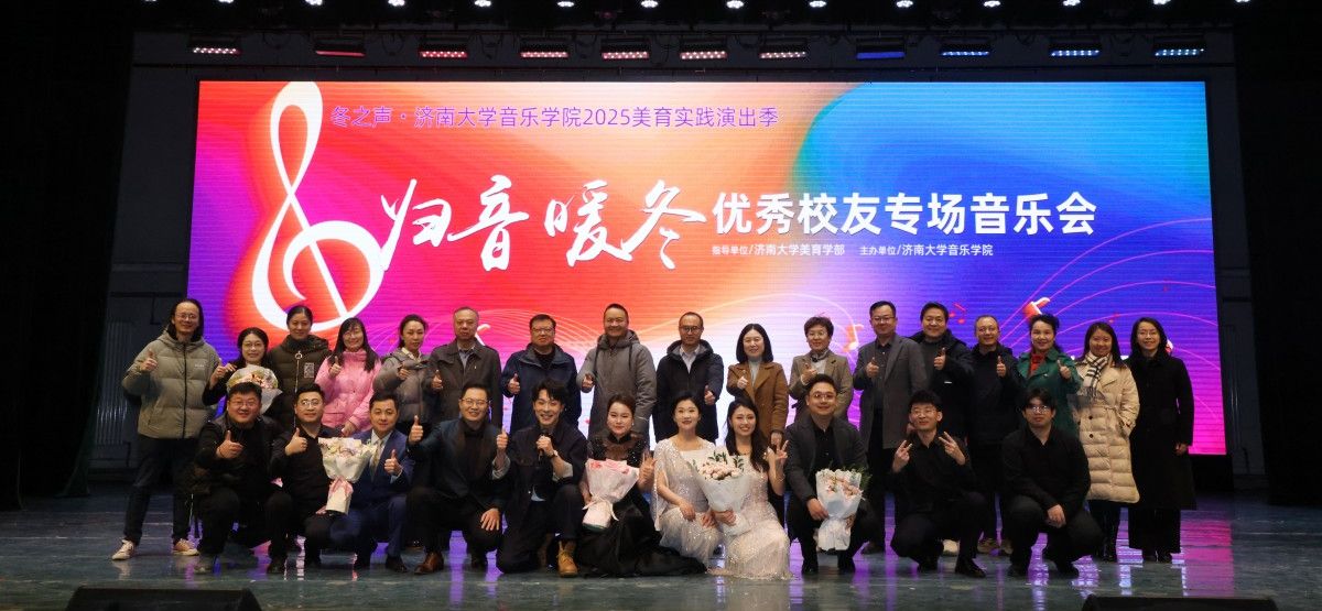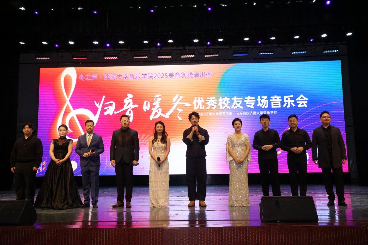 這場優(yōu)秀校友音樂會不僅是一場溫暖震撼的視聽盛宴,更是濟南大學(xué)音樂學(xué)院數(shù)載深耕、桃李滿園的生動縮影,是學(xué)院“音和樂諧、德藝雙馨”育人理念的璀璨綻放。多年來,音樂學(xué)院始終將藝術(shù)實踐與教學(xué)創(chuàng)新相融合,培養(yǎng)出一批批技藝與情懷兼具的優(yōu)秀人才。他們活躍在音樂教育、舞臺表演、文化傳播等廣闊領(lǐng)域,以專業(yè)實力閃耀崗位,以藝術(shù)熱忱回饋社會,持續(xù)印證并推動著學(xué)院人才培養(yǎng)體系的完善與超越。我們始終堅信,在美育之光的持續(xù)照耀下,濟大音樂學(xué)子必將在感知美、詮釋美、創(chuàng)造美的道路上,不斷傳承濟大精神,以更飽滿的激情、更精湛的技藝、更深厚的情懷,譜寫屬于新時代的華彩樂章,讓藝術(shù)之魂在時代回響中生生不息。