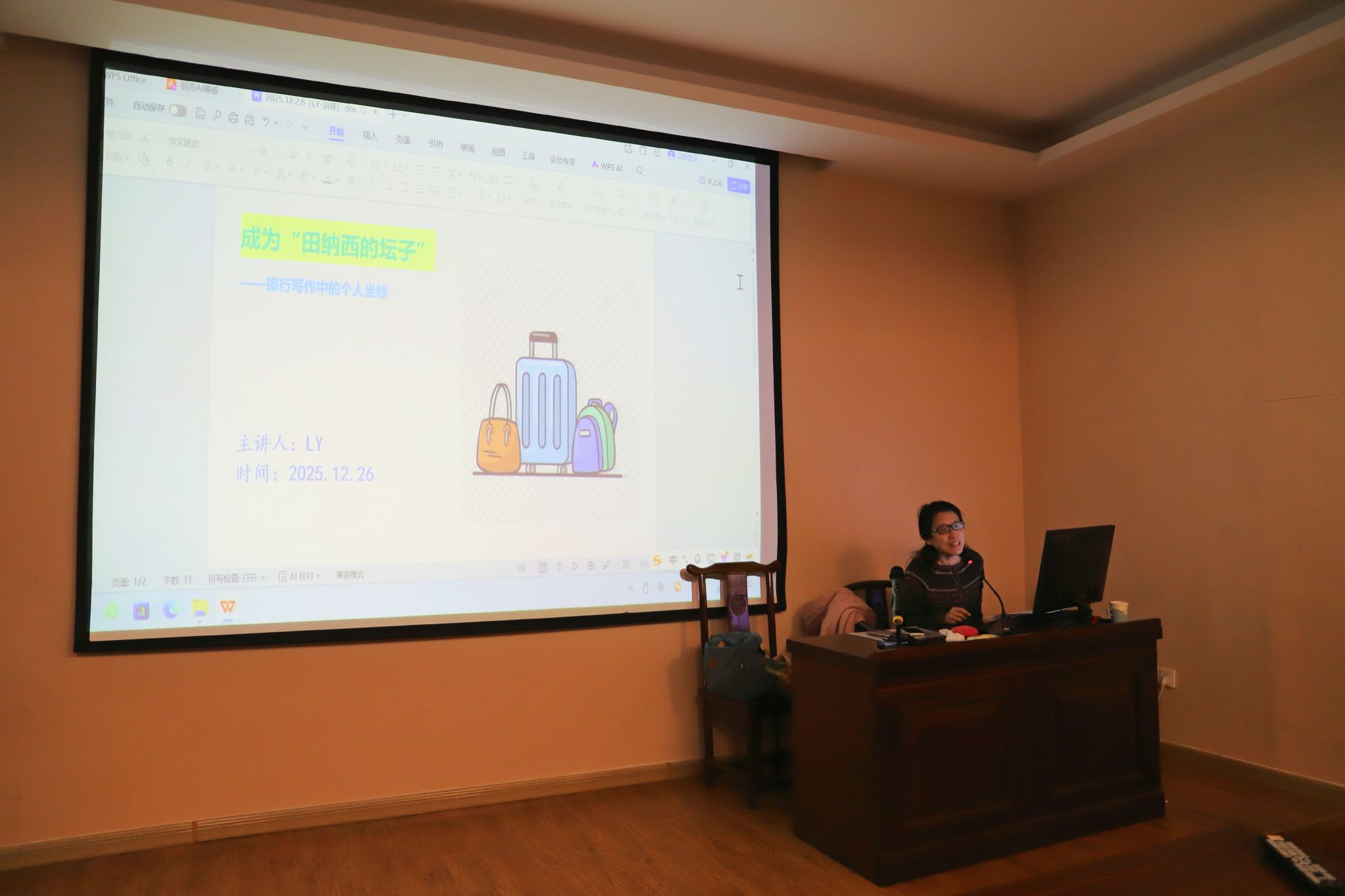 為持續(xù)推進(jìn)學(xué)校美育工作高質(zhì)量發(fā)展,12月26日,由濟(jì)南大學(xué)美育學(xué)部、教務(wù)處、團(tuán)委主辦,文學(xué)院承辦的“濟(jì)大論壇·美育大講堂”《成為“田納西的壇子”——旅行寫(xiě)作中的個(gè)人坐標(biāo)》在三教舜耕書(shū)院舉行。濟(jì)南大學(xué)文學(xué)院教授、著名詩(shī)人路也擔(dān)任主講,60余名師生到場(chǎng)聆聽(tīng),共同探討旅行寫(xiě)作的審美意蘊(yùn)。
